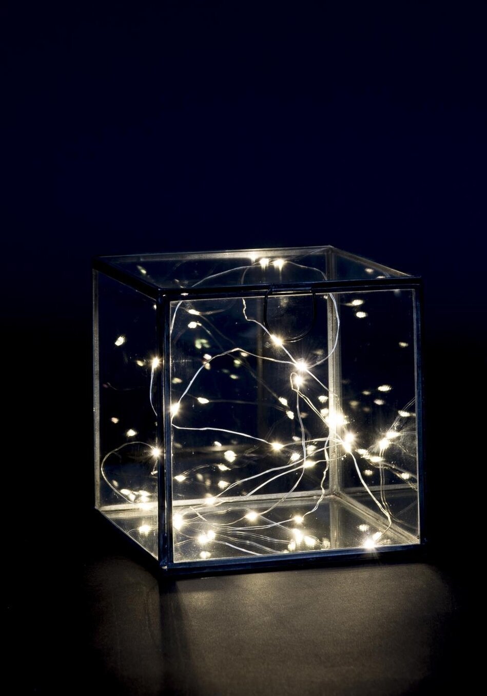 Bilden visar en förtrollande installation av en ljusslinga i en glasbehållare. Den här produkten, en ljusslinga med 20 LED-ljus från IB Laursen, finns hos Köpstaden.se. Slingan är elegant placerad i en kubformad glaskub som står mot en mörk bakgrund. Det tunna, silverfärgade tråden slingrar sig genom kuben i en graciös och oregelbunden design, vilket ger ett lekfullt och dynamiskt utseende.