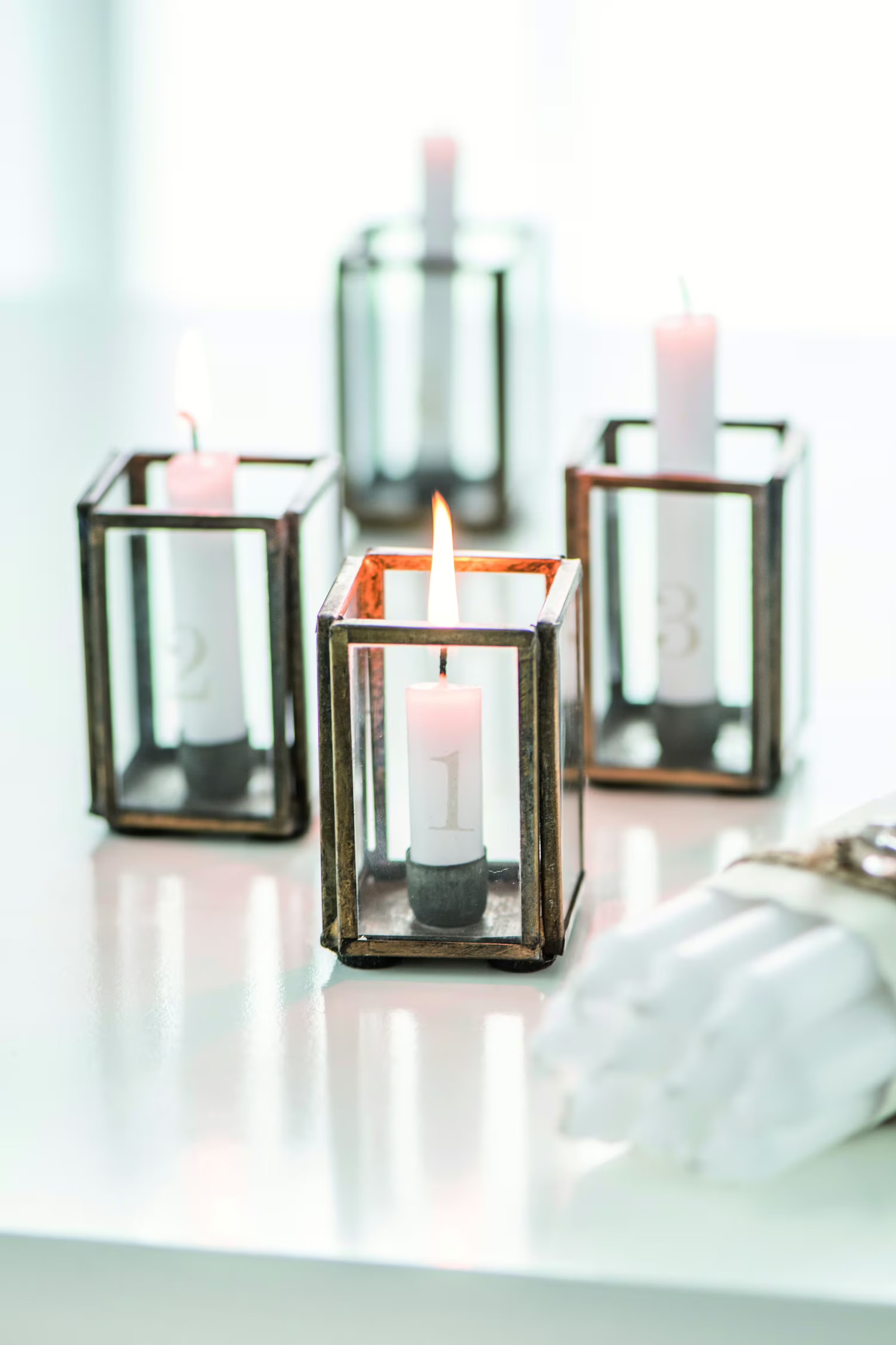 Charmiga glasboxar numrerade med 1-4 som blir en fin adventsljusstake med ljus samt dekorationer.