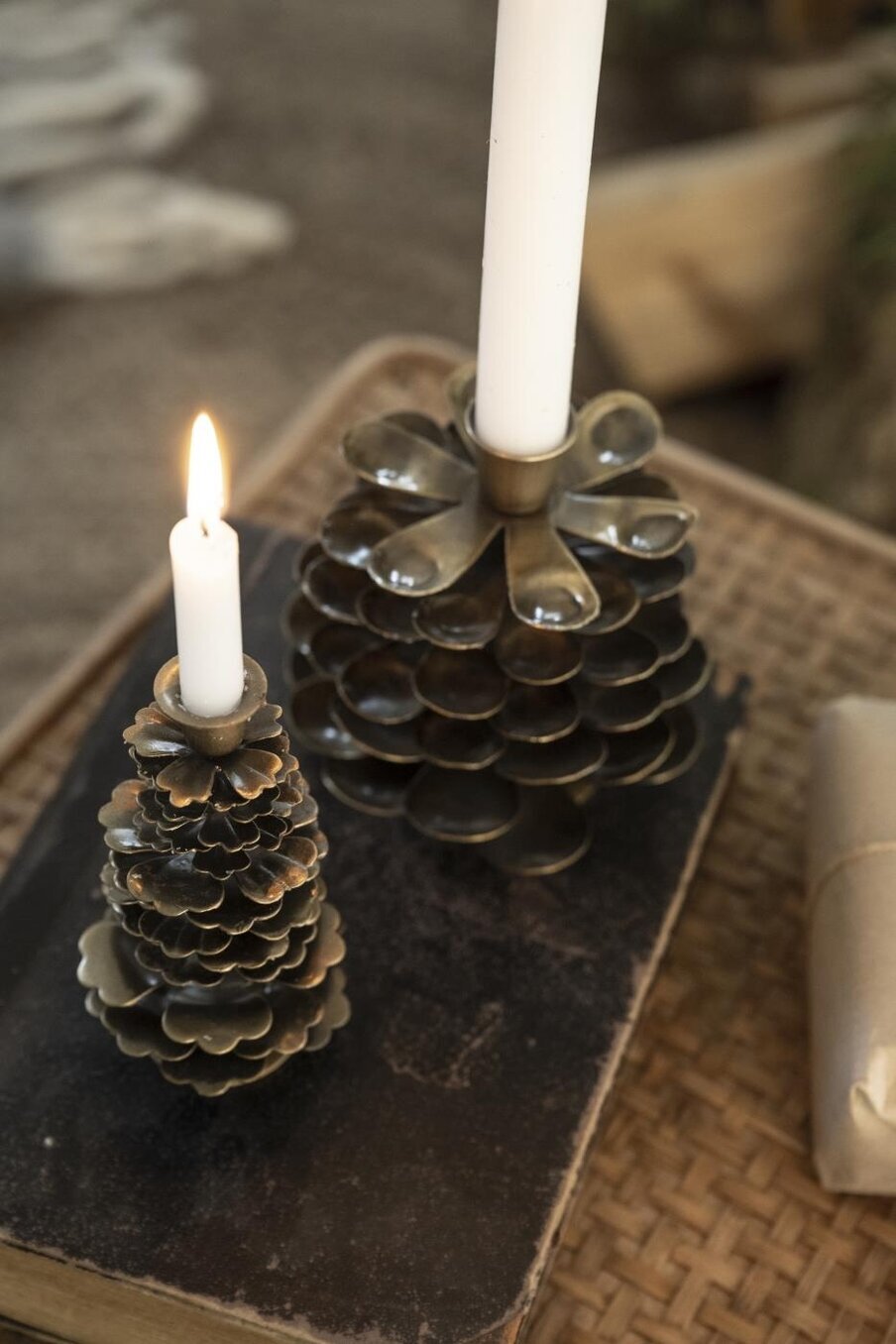 Den första ljusstaken, i förgrunden, är något mindre och smalare. Den har en rad lager som liknar kottefjäll och skapar en intressant visuell textur. Ett vitt stearinljus är tänd i hållaren, och lågan kastar ett mjukt sken över mässingsytan och får den att lysa med en varm ton. Ljusets fladdrande låga ger en känsla av rörelse och liv åt bilden.