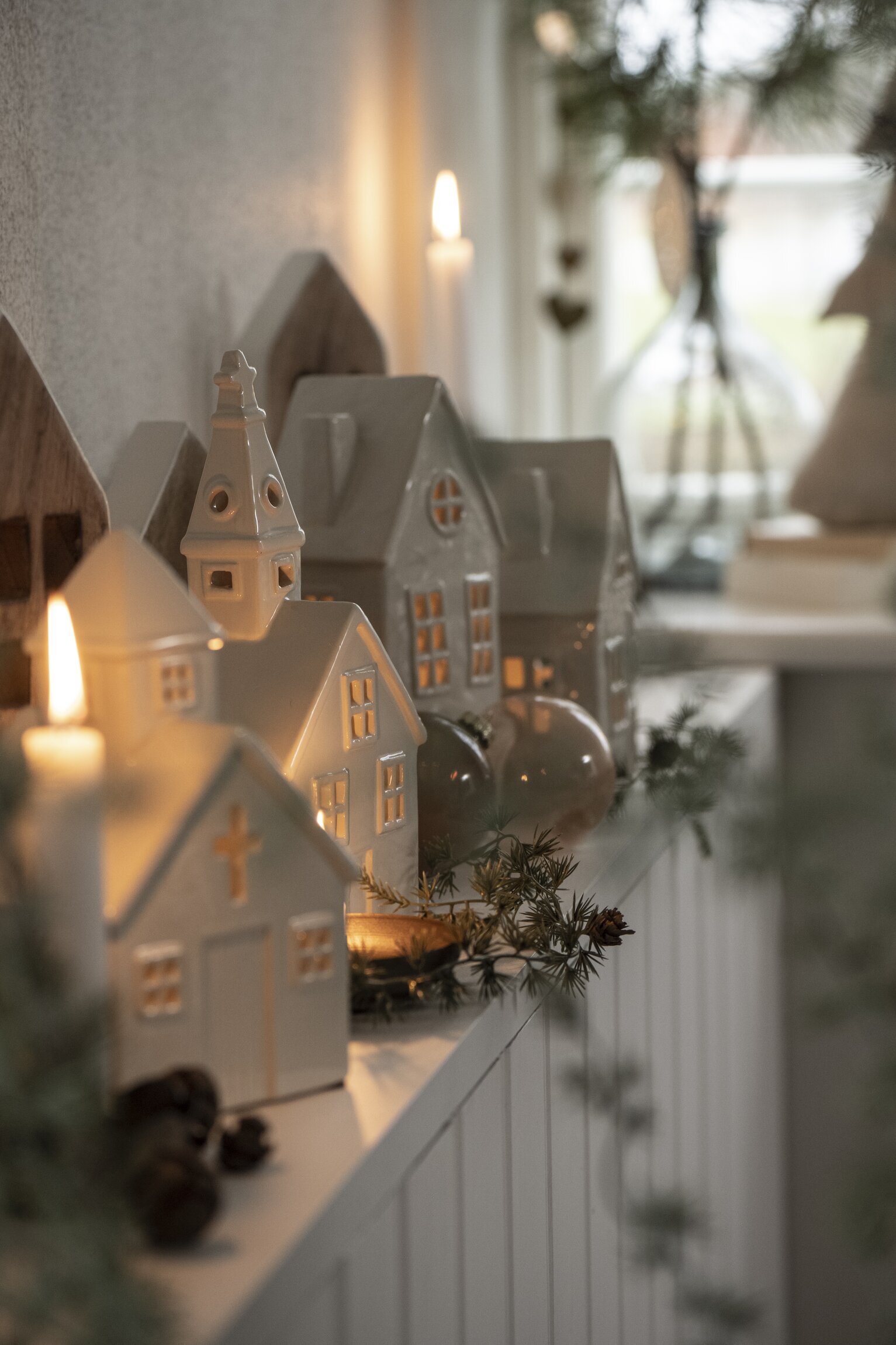 Bilden från Köpstaden.se visar en dekorativ scen med flera små keramikhus, arrangerade på en hylla. Dessa små hus är en del av produkten "Ljuslykta Hus Välvd Dörr Creme" från varumärket IB Laursen. De är stilfullt placerade i rad och var och en har små fönster och dörrar, som låter ljuset skina igenom och skapa en mjuk, inbjudande atmosfär.