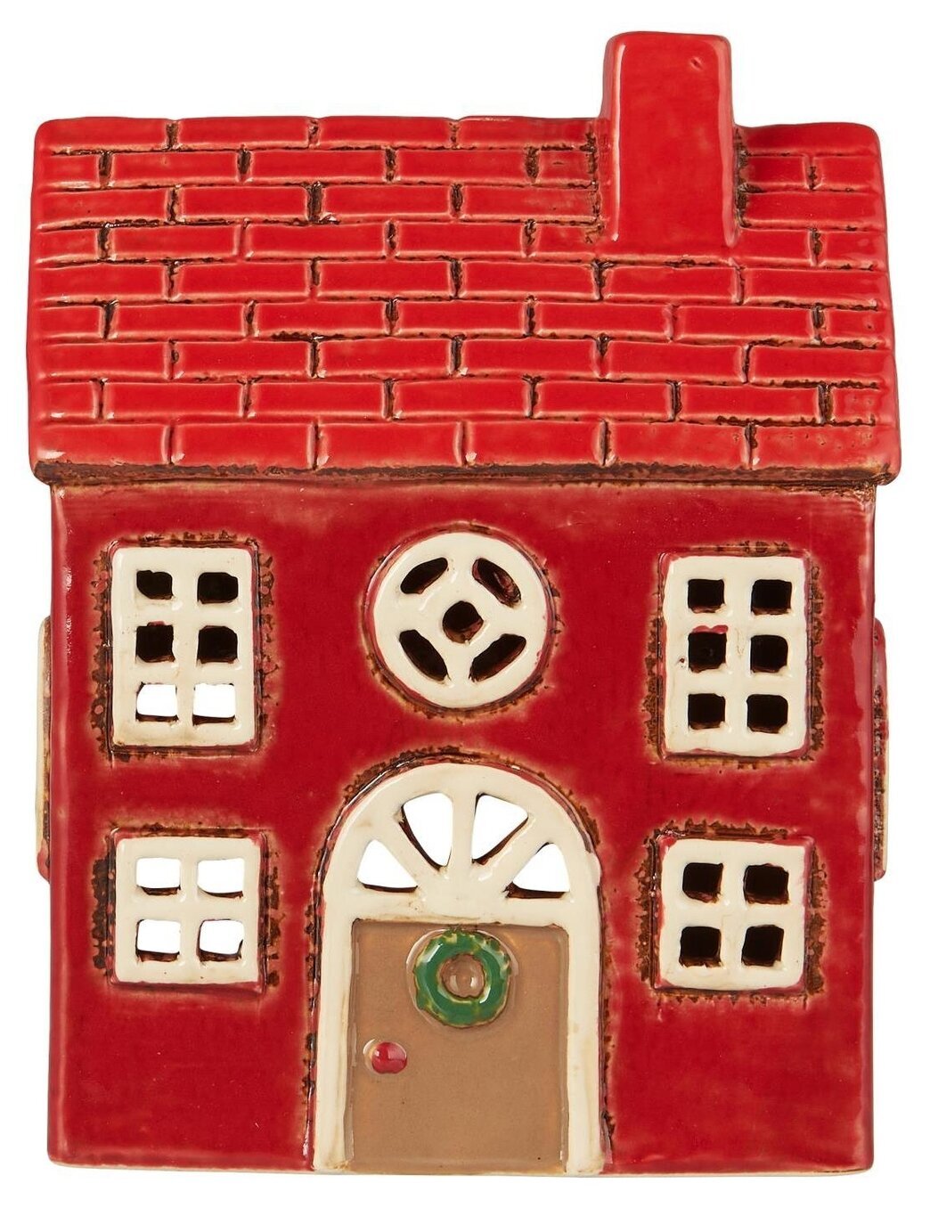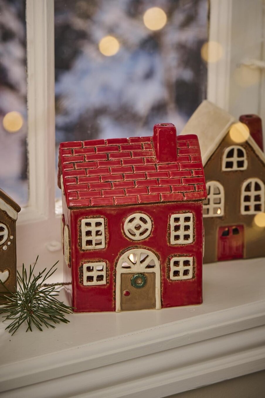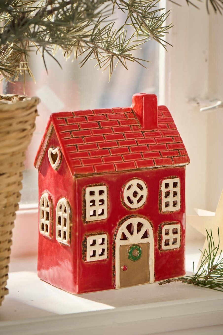 Ljuslykta keramikhus i vacker röd nyans med dörrkrans från IB Laursen. Läs mer