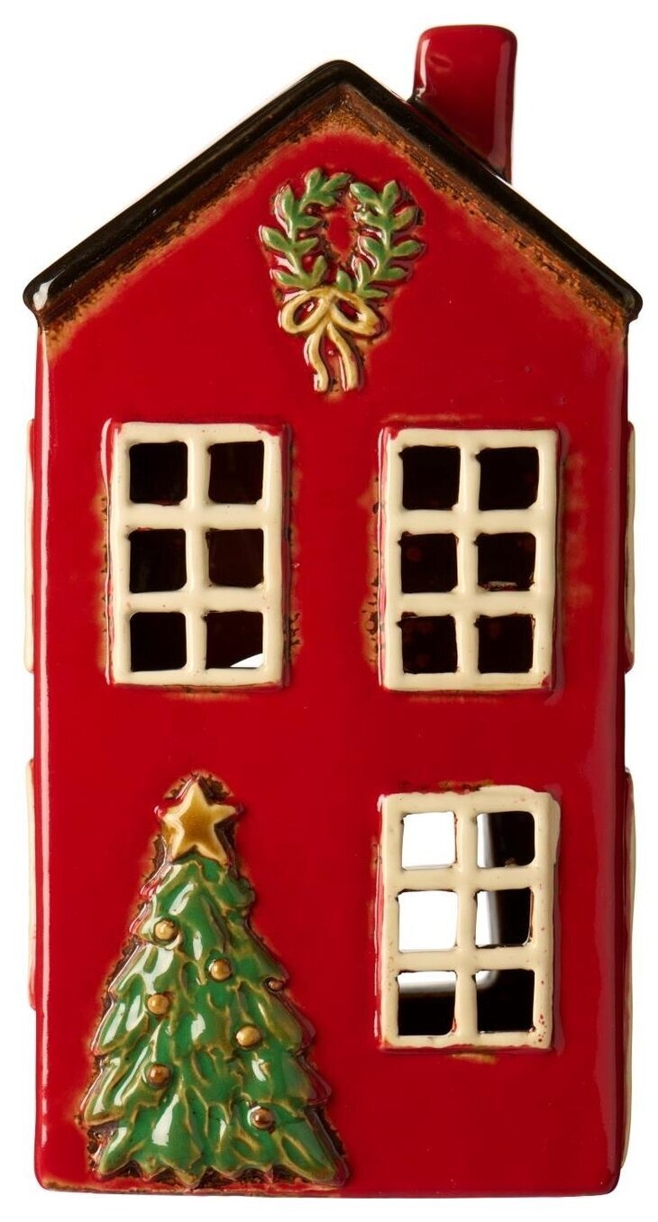 Detta röda hus är dekorerat med en julkrans ovanför fönstret och en gran med gyllene stjärna vid entrén – en perfekt symbol för julens glädje. När ljuset inuti tänds lyser de små rutorna upp och ger känslan av ett varmt hem fyllt av julstämning. En dekorativ lykta som passar lika bra ensam som tillsammans med de andra husen i serien.