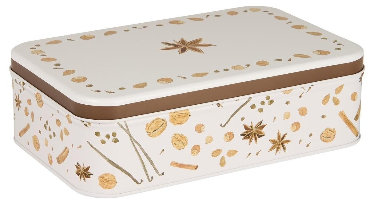 Denna stilfulla plåtburk är dekorerad med kanelstänger, stjärnanis, valnötter och andra kryddiga detaljer som påminner om julens dofter och smaker. Perfekt för att förvara småkakor, nötter eller andra godsaker, och lika vacker att ha framme som en del av juldekorationen.