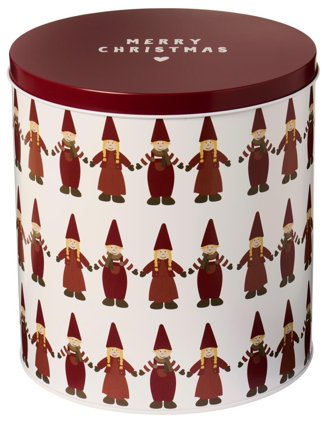 Denna runda plåtburk sprider julglädje med sitt härliga mönster av små tomtar som håller varandra i handen. Med sitt röda lock, prytt med texten Merry Christmas, blir den en perfekt förvaring för kakor, lussekatter eller julgodis. En dekorativ burk som gör sig lika bra på fikabordet som under granen.