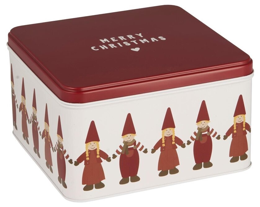 Denna charmiga plåtburk pryds av små tomtar som håller varandra i handen och sprider både värme och glädje. Locket i djupt rött har texten Merry Christmas och gör burken perfekt för att förvara pepparkakor, knäck eller andra godsaker. En härlig detalj att ställa fram på fikabordet eller ge bort fylld med hembakat.