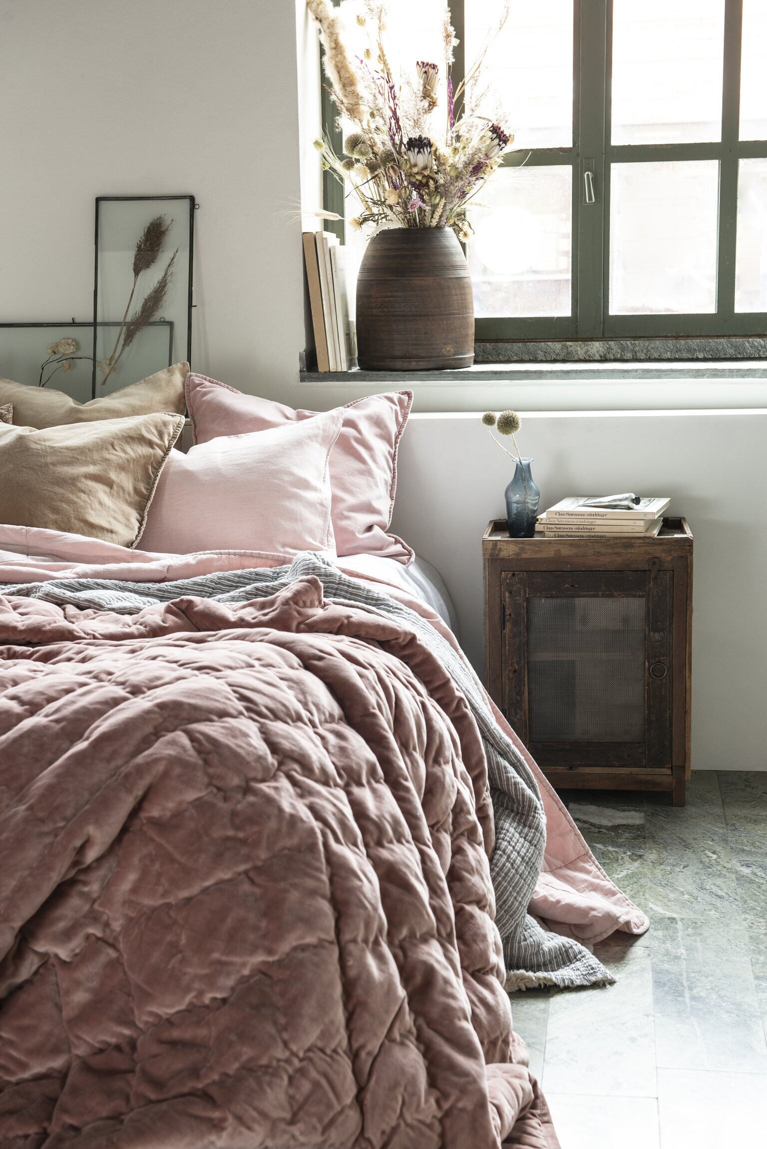 Till vänster märks en säng med påslakan i en mjuk rosa ton, vars täcken och kuddar ser både inbjudande och bekväma ut. De olika texturerna skapar en rikedom i bilden, från det quiltade överkastet till de släta lakanen. På fönsterbrädan står en stor vas fylld med torkade växter som ger liv och höjd till rummet. Dessa växter, i jordnära nyanser, harmonierar med resten av dekoren och kompletterar det naturliga ljus som strömmar in genom fönstret.