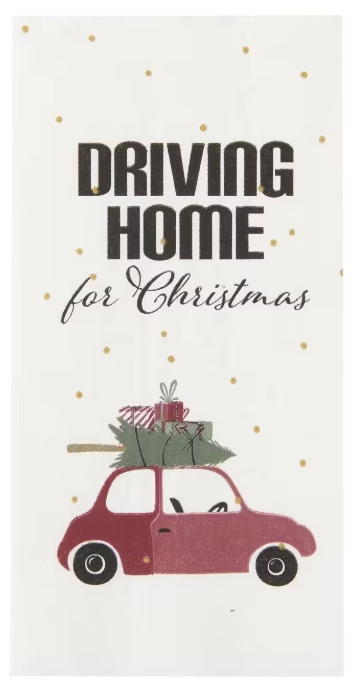 På bilden visas en servett från Köpstaden.se med motivet "Driving Home For Christmas", designad av IB Laursen. Servetten är en rektangulär produkt med en ljus bakgrund som ger ett klart intryck. Centralt i bildens övre del syns texten "Driving Home for Christmas", där orden är skrivna i olika typsnitt. "Driving Home" är tryckt med stora, svarta bokstäver som framträder tydligt, medan "for Christmas" har en mer elegant och snirklig stil som tillför ett mjukare uttryck.