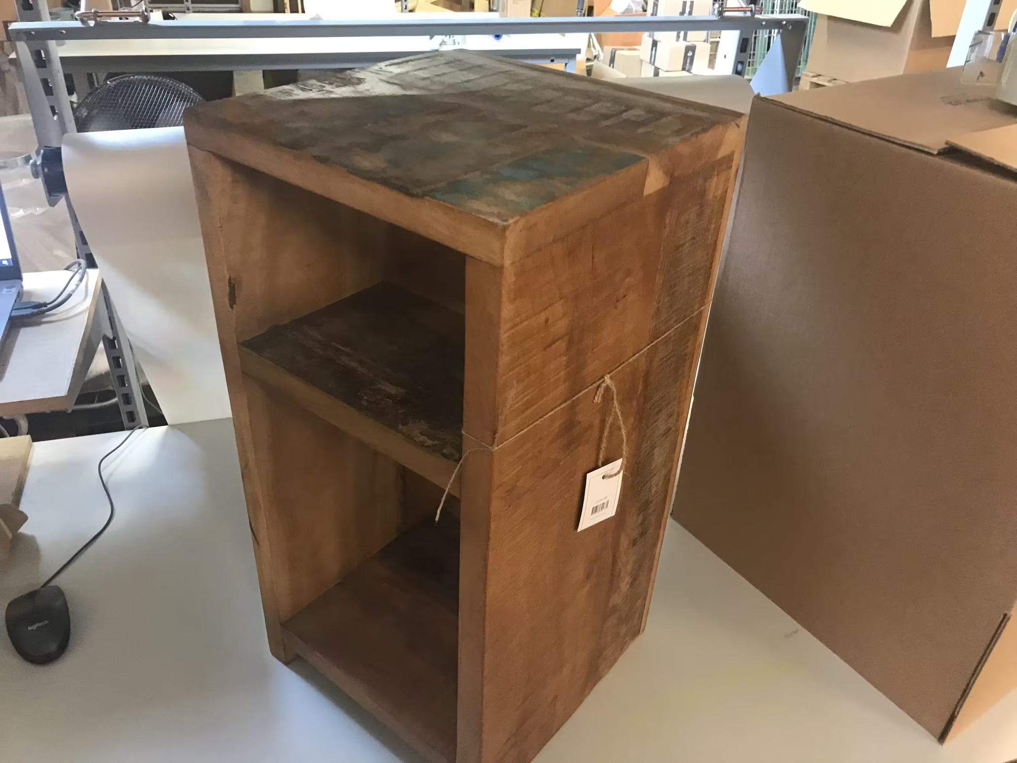 Sidobordet har en rektangulär form och står på en plan yta, vilket gör det lättplacerat i olika hem- och kontorsmiljöer. Ytan på bordet visar en variation i färgtoner och strukturer, vilket framhäver skiftningar i träslaget och ger bordet dess karaktäristiska utseende. Färgerna sträcker sig från ljusbruna till mörkare nyanser, vilket ger bordet ett naturligt utseende som påminner om återvunnet trä.