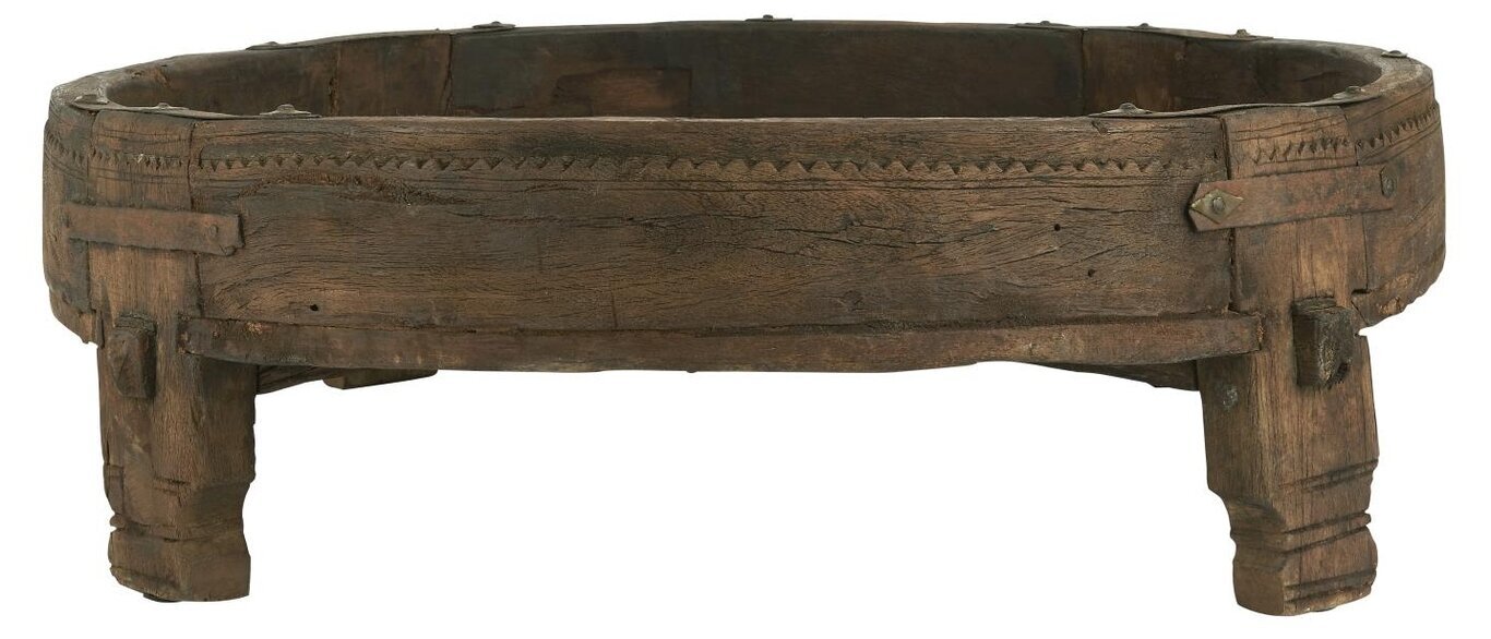 Bordets ben är stabila och något kortare, vilket understryker bordets låga design och gör det idealiskt för placering på en matta eller som en del av ett loungeområde. Varje ben är skulpterat med samma noggrannhet och omsorg, vilket säkerställer hållbarhet och stabilitet. De små metallbeslagen som används för att fixera delarna, tillför en industriell touch till det annars mycket traditionella utseendet.