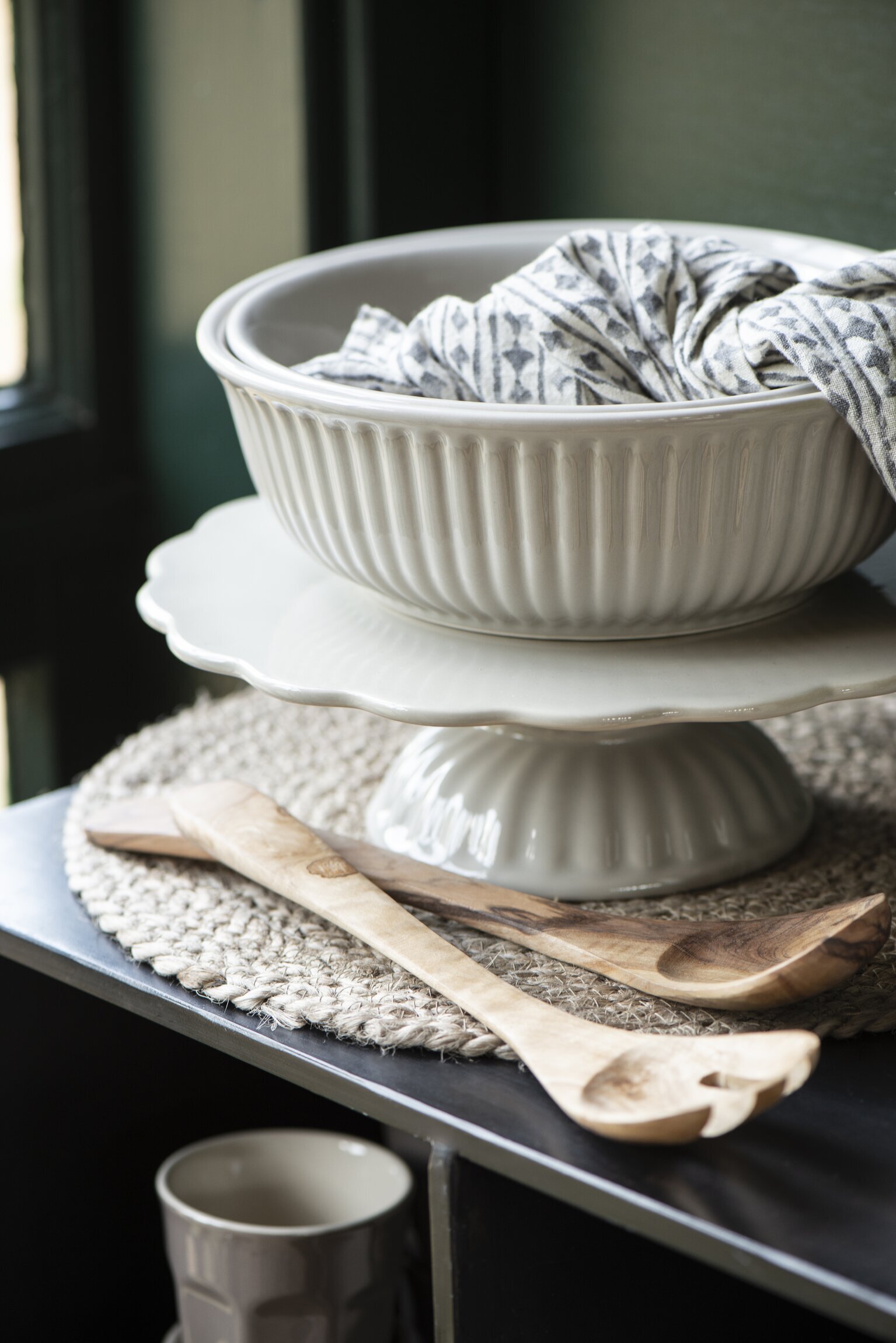 Bilden från Köpstaden.se visar en smakfullt arrangerad scen som fokuserar på serveringsskålen Mynte Stor i färgen Latte från varumärket IB Laursen. Skålen är placerad på ett elegant tårtfat, vars vågiga kanter ger en touch av klassisk design. Det som gör skålen särskilt intressant är dess räfflade yta; de vertikala linjerna bidrar till en känsla av strukturerad enkelhet.