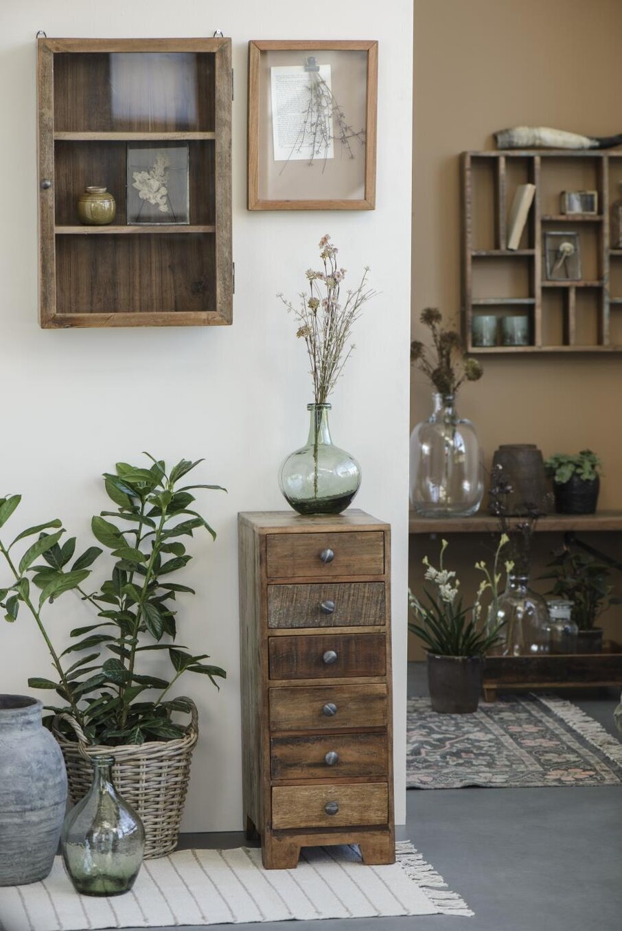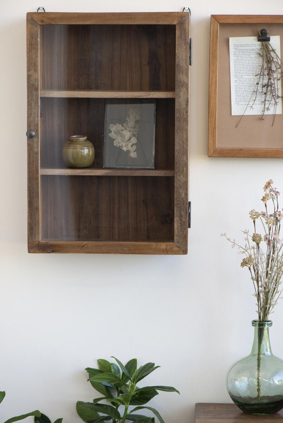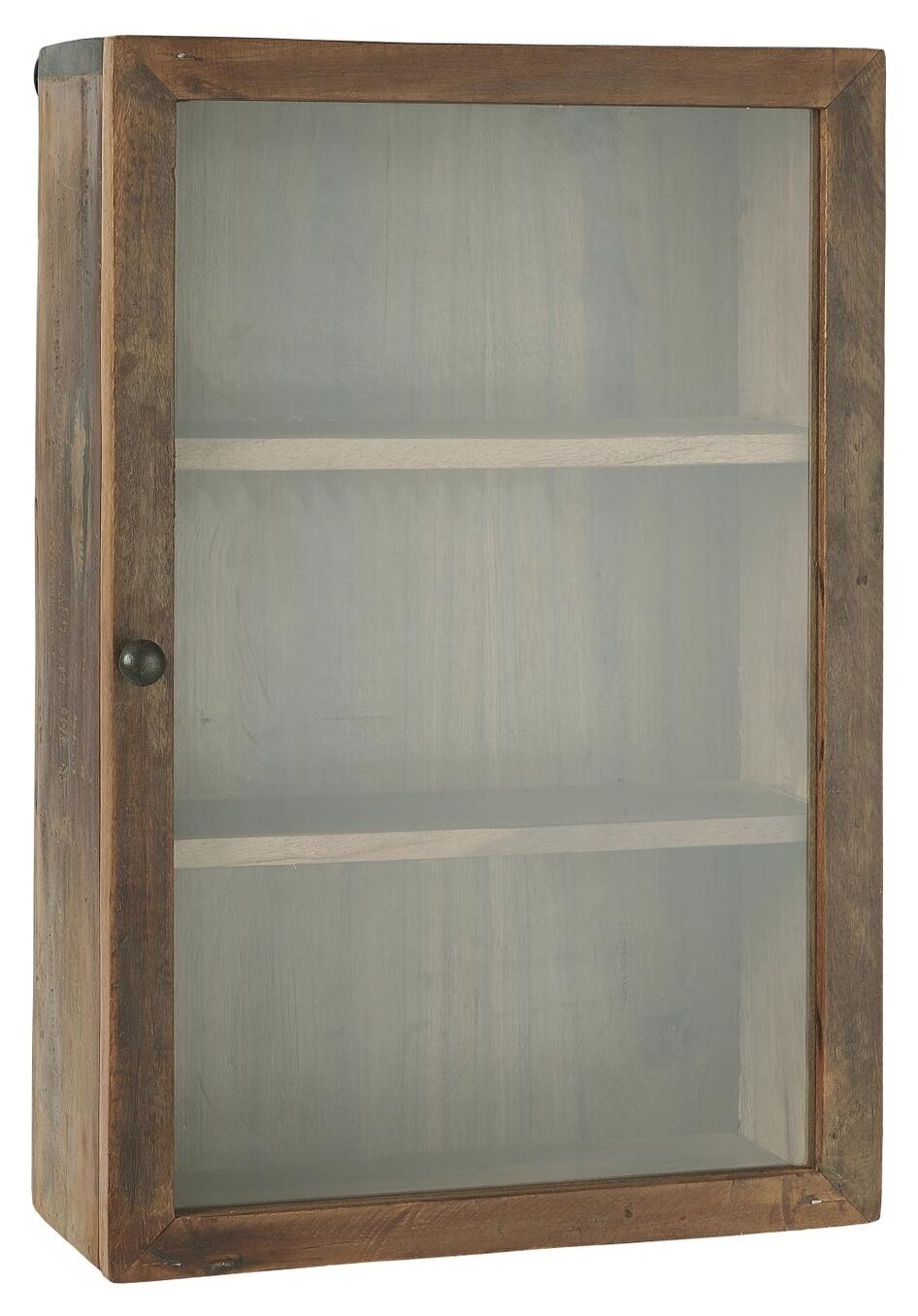 Vackert & unikt väggskåp med 2 hyllplan samt glasdörr med knopp, tillverkat av Indiskt återvunnet trä. Det kan förekomma sprickor, slitningar, hål samt skillnader i utseende då varje skåp är unikt.