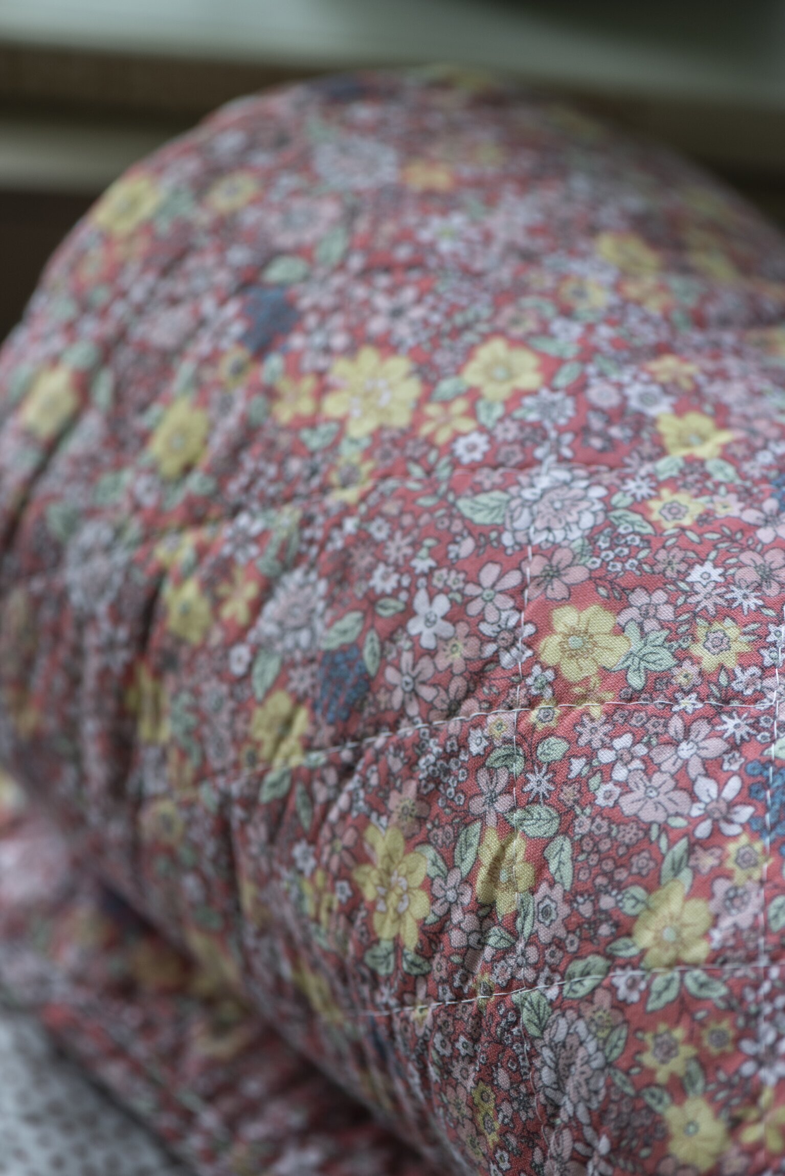 Materialet i pläden ger intryck av att vara både mjukt och slitstarkt, med tydliga quiltade sömmar som skapar en texturerad yta. De täta stygnen bidrar till att ge pläden struktur och hållbarhet. Detaljerna i blomornas design är intrikata; varje blomma har noggrant återgivna blad och kronblad, vilket förstärker den konstnärliga känslan.
