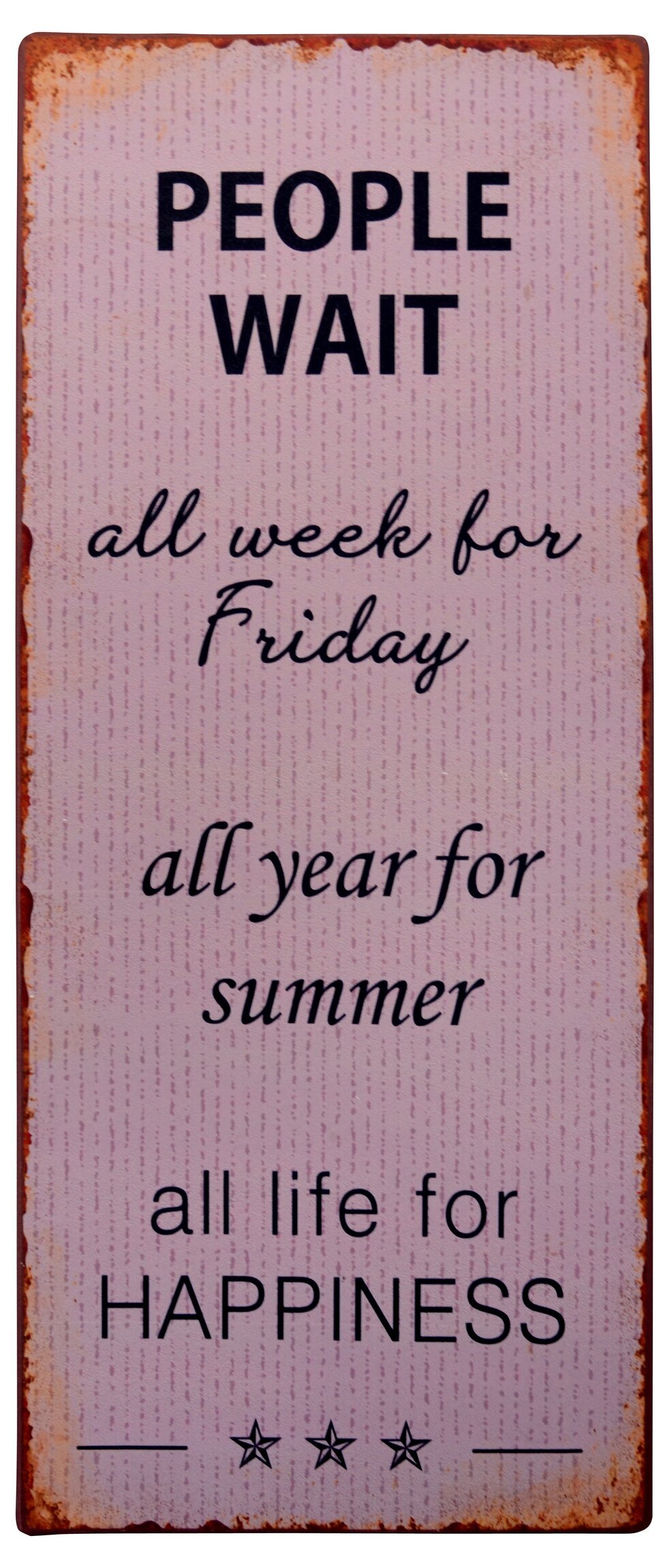 Överst på skylten finns texten "People Wait", skriven i fet stil. Orden är placerade mot en blekrosa bakgrund som är täckt med svaga, lodräta linjer, vilket skapar en subtil textur i designen. Den centrala delen av skylten innehåller två meningar skrivna i en elegant kursiv font: "all week for Friday" och "all year for summer". Dessa ord är strategiskt placerade för att dra blicken från toppen till botten av skylten.