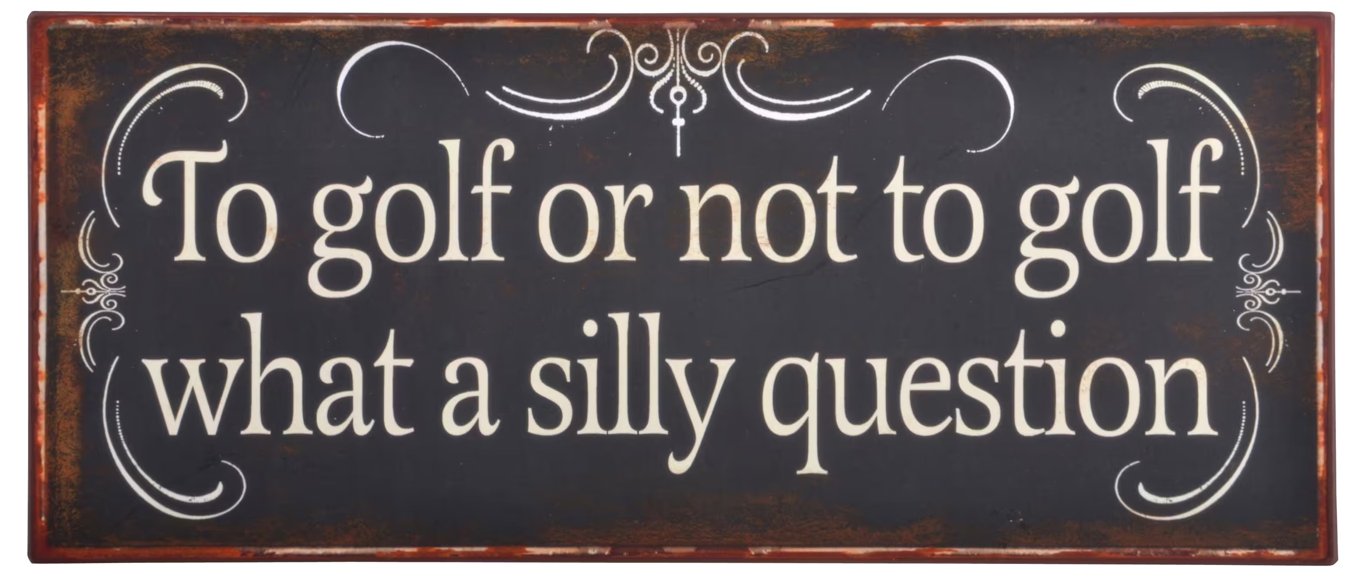 Texten på skylten är effektfull och består av stora, tydliga bokstäver i ljus nyans som står i stark kontrast mot den mörkare bakgrunden. Detta gör det enkelt att avläsa budskapet från avstånd, vilket kan attrahera både gäster och golfentusiaster. Orden “To golf or not to golf what a silly question” levererar ett lekfullt budskap som kan locka skratt och skapa konversationer.