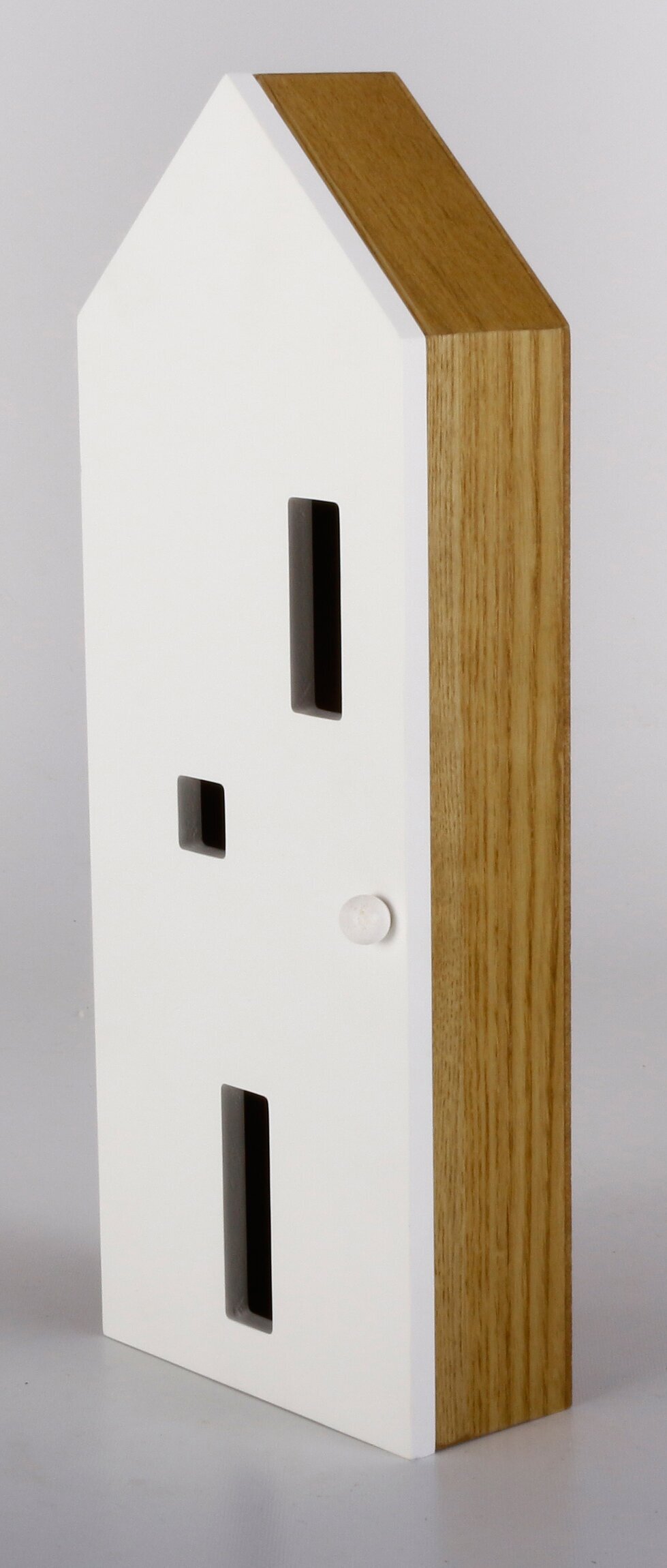 Den ena sidan av nyckelskåpet är tillverkad i trä, vilket ger en fin kontrast till den vita ytan. Träet har en slät, naturlig finish som framhäver träets ådringar och ger en känsla av värme. Skåpets kantiga topp är formad som ett tak, vilket förstärker husdesignen och ger det en egenartad arkitektonisk touch.