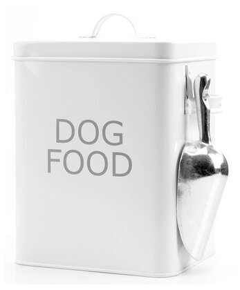 På sidan av plåtburken finns en metallskopa, som hänger fast för bekväm tillgång till hundmaten. Denna skopa är tillverkad av en blank metall och har en funktionell och robust känsla. Den är säkerställd med en enkel men effektiv fästanordning, som gör att den enkelt kan tas loss och användas vid behov.