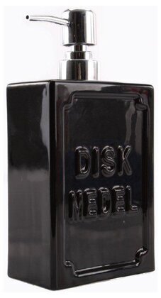 Pumpen har en tydligt strukturerad yta där orden "DISKMEDEL" framhävs i relief på framsidan. Detta präglade mönster ger en taktil känsla och underlättar identifieringen av innehållet. Denna designdetalj, tillsammans med det minimalistiska formspråket, bidrar till en harmonisk och praktisk estetisk.
