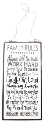 Tavlan hänger enkelt från ett naturligt snöre, som är fastsatt i dess övre kanter, vilket ger den ett traditionellt och handgjort intryck. Texten är det centrala elementet här och presenteras i olika storlekar och typsnitt för att betona de olika budskapen. Överst på tavlan står texten "Family Rules" i stora, centrala bokstäver, vilket direkt fångar blicken.