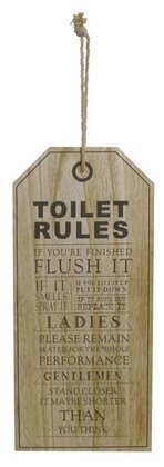 Själva tavlan är gjord av material som påminner om trä och har en naturlig, lite väderbiten finish, vilket ger ett intryck av både enkelhet och funktionalitet. Bakgrunden har en ljus, träfärgad ton som kontrasterar fint mot den svarta texten. Texten, som är centralt placerad, är tryckt i olika storlekar och stilar, vilket skapar en dynamisk och visuellt tilltalande effekt. Högst upp står orden "Toilet Rules" i en större, djärv textstil som drar till sig uppmärksamhet.