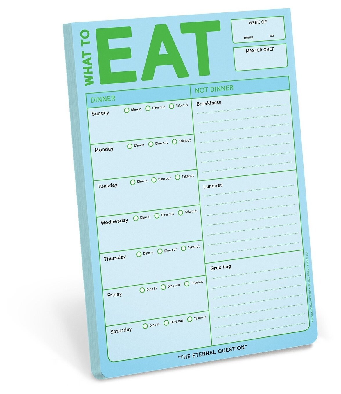 Praktiskt pappersblock med magnet för planering av veckans menyer, från KnockKnock. Slipp den oftast återkommande vardagliga frågan - Vad ska vi äta idag/ikväll & förbered veckans måltider. Totalt 60 stycken ark som räcker under hela året.