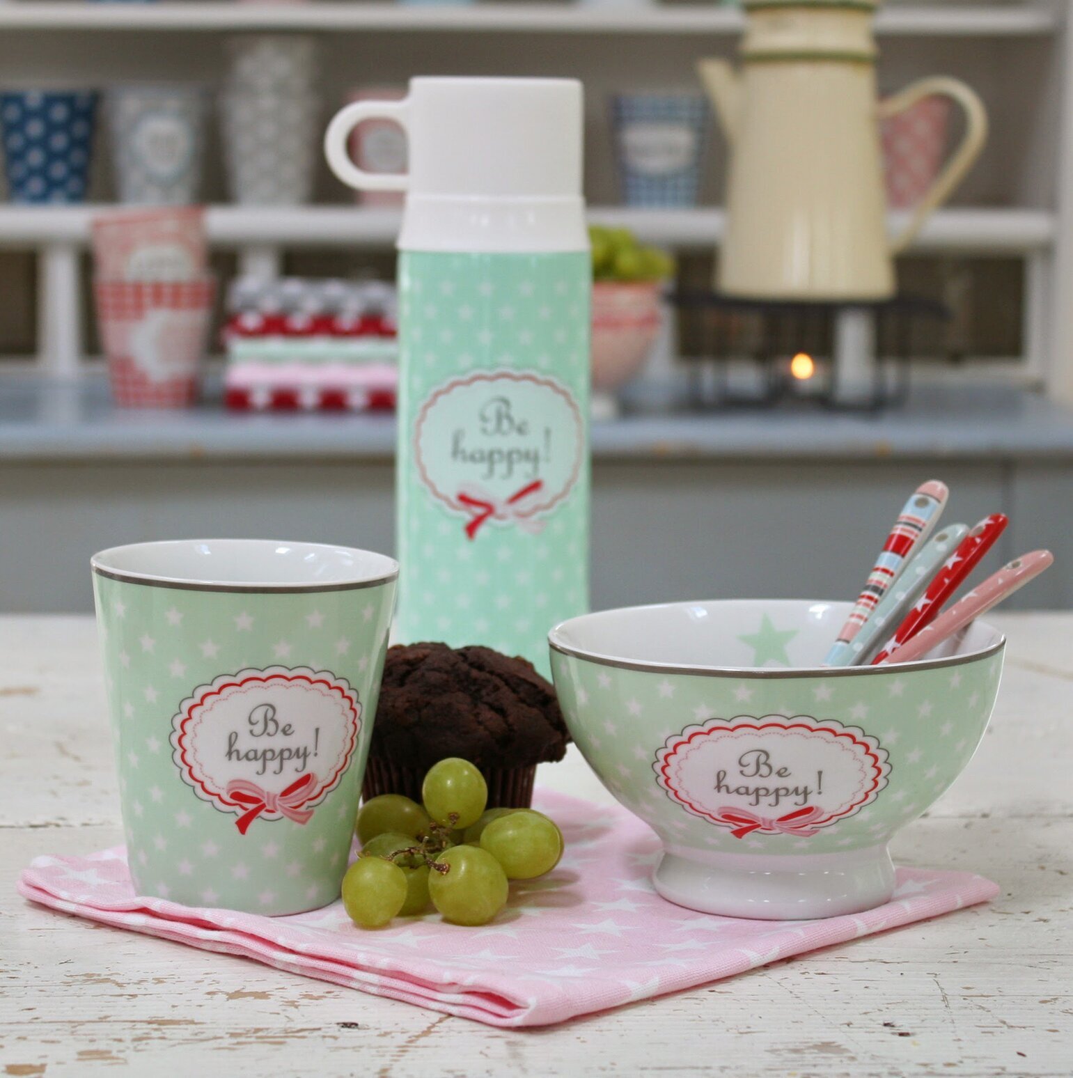 Underbart ljuvlig porslinsmugg från Krasilnikoffs serie Happy Mugs. Porslinsmuggen har en pastellgrön bas med vita stjärnor samt röda & grå detaljer. Läs mer