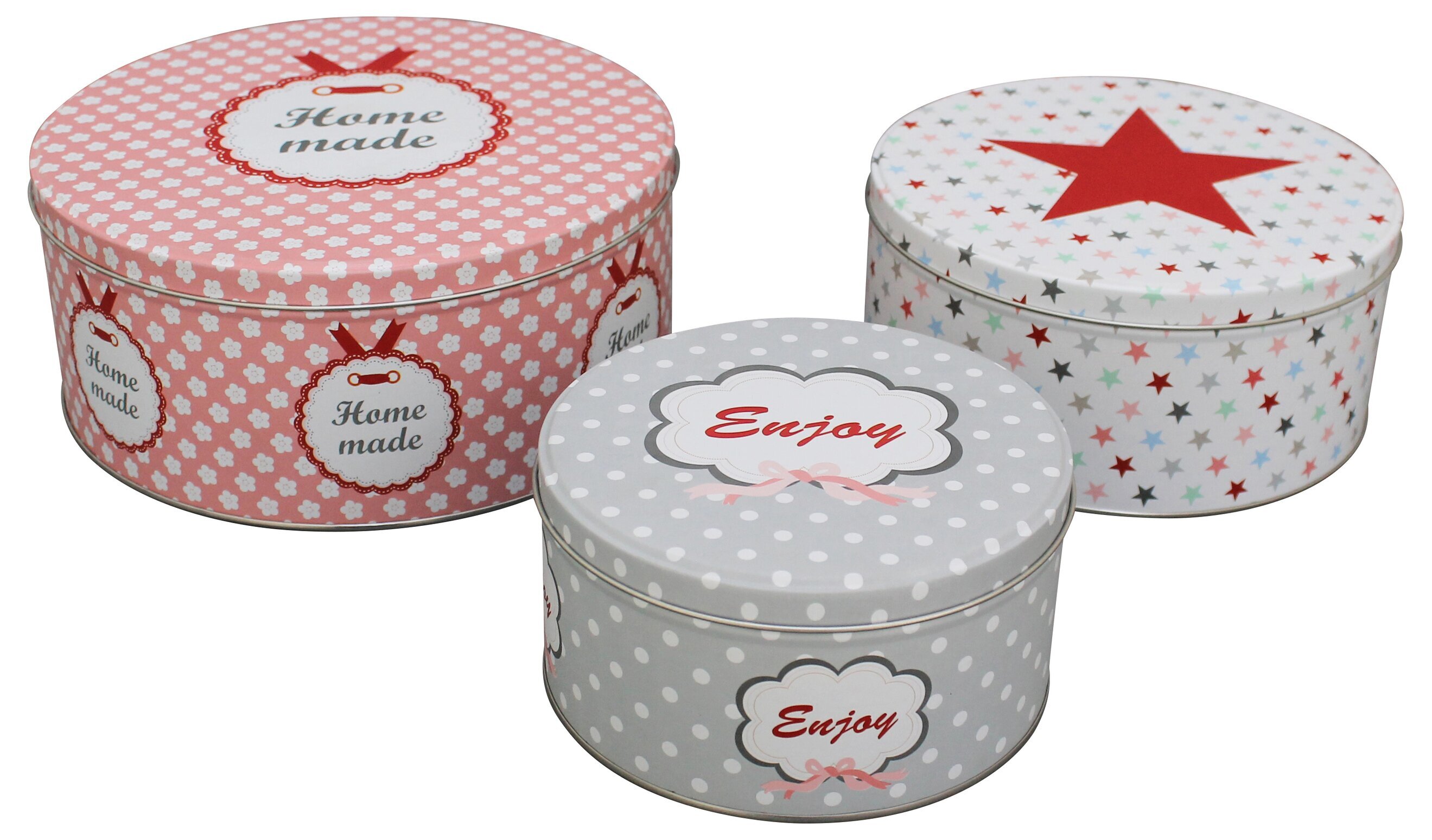 Supersnygga plåtburkar från danska Krasilnikoff som levereras i set om 3. Plåtburkarna har 3 olika mönster samt texter såsom - Home Made - Enjoy.