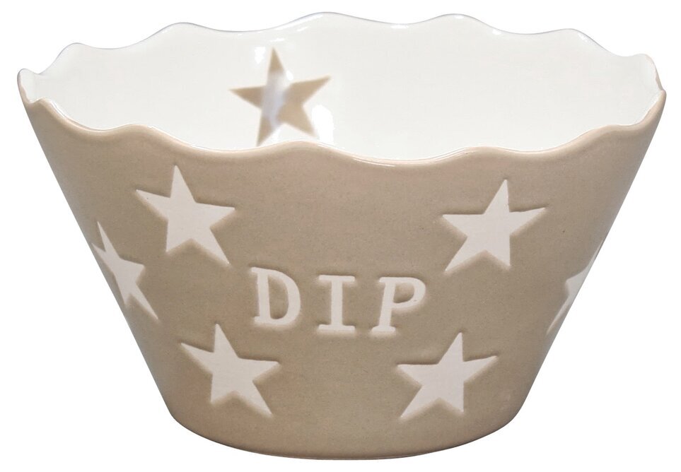 Härlig porslinsskål från Krasilnikoffs serie Happy Stars med texten DIP. Porslinsskålen har en beige bas med vita stjärnor. Fint att kombinera dessa skålar som finns i ett flertal olika färger & med olika texter. Tål maskindisk samt kan användas i micro. Skålarna är handgjorda så det kan förekomma viss variation i färg & utseende.