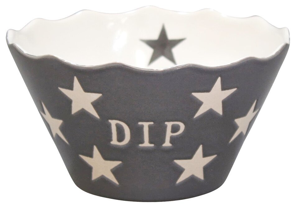 Härlig porslinsskål från Krasilnikoffs serie Happy Stars med texten DIP. Porslinsskålen har en grå bas med vita stjärnor. Fint att kombinera dessa skålar som finns i ett flertal olika färger & med olika texter. Tål maskindisk samt kan användas i micro. Skålarna är handgjorda så det kan förekomma viss variation i färg & utseende.