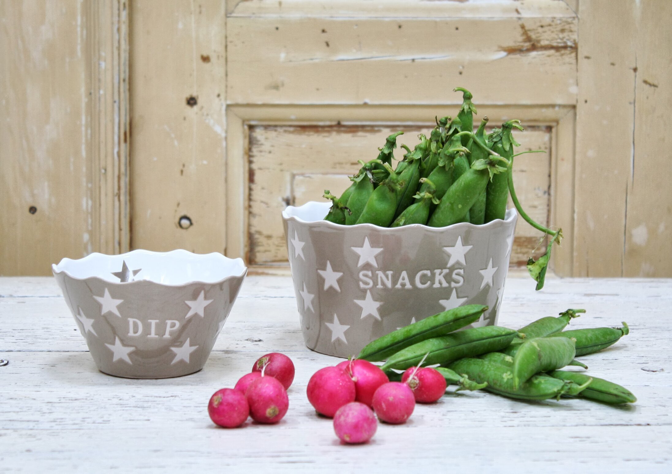 Härlig porslinsskål från Krasilnikoffs serie Happy Stars med texten SNACKS. Porslinsskålen har en beige bas med vita stjärnor. Läs mer
