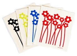 Den röda disktrasan har en framträdande design där de röda blommorna står ut med sina böljande stjälkar och runda blomblad, vilket skapar en upplyftande atmosfär. De andra trasorna kompletterar med sina egna livfulla färger, var och en med blommor i motsvarande nyans: djupblått, solgult och klassiskt svart. Den krämvita basen på varje disktrasa ger en neutral bakgrund som förstärker blomfärgerna och gör att mönstret känns både modernt och lekfullt.