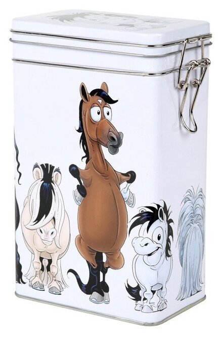 Burken har en rektangulär form och är tillverkad i metall, vilket ger den en robust och stabil känsla. Ytan pryds av livliga illustrationer av hästar som fångar blicken direkt. Motivet visar tre olika hästar, där den centrerade hästen är något större och brun i färgen. Denna häst står upprätt med stora, uttrycksfulla ögon, vilket ger den en lekfull framtoning.