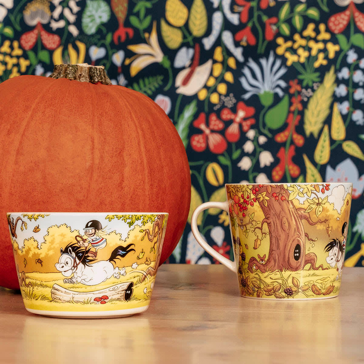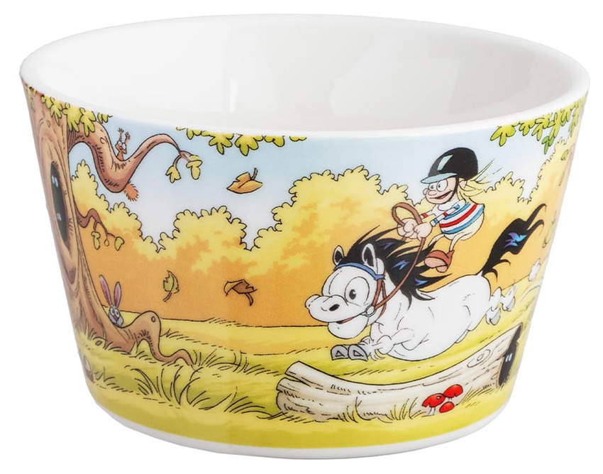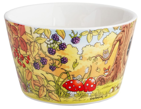 Vit porslinsskål med helomslutande motiv av Lena Furberg, där Mulle tar en fartfylld skogstur bland svampar och virvlande löv. De varma höstfärgerna och det detaljrika mönstret gör skålen lika fin till frukostyoghurt som till snacks och dessert. Rymmer ca 3.5 dl.