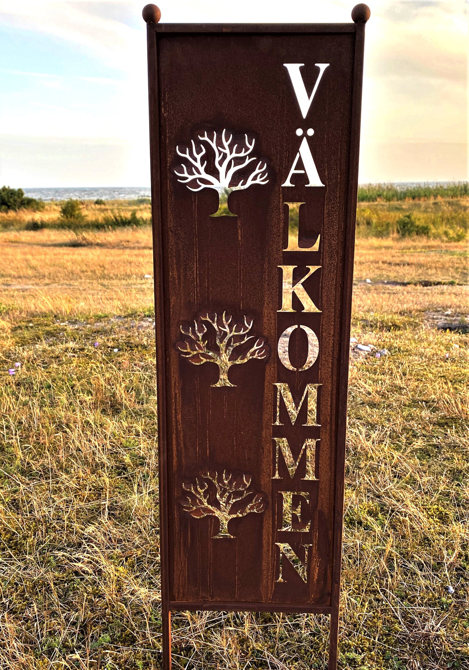 Skärmen är avlång och rektangulär med en robust och jordnära rostig yta, perfekt för att stå emot olika väderförhållanden. På dess yta finns texten "VÄLKOMMEN" vertikalt placerad med stiliserade trädformer inbäddade emellan. Orden och dekorationerna är utskurna, vilket ger en intressant effekt där omgivningens ljus och skuggor kan spela igenom, beroende på ljusets vinkel.