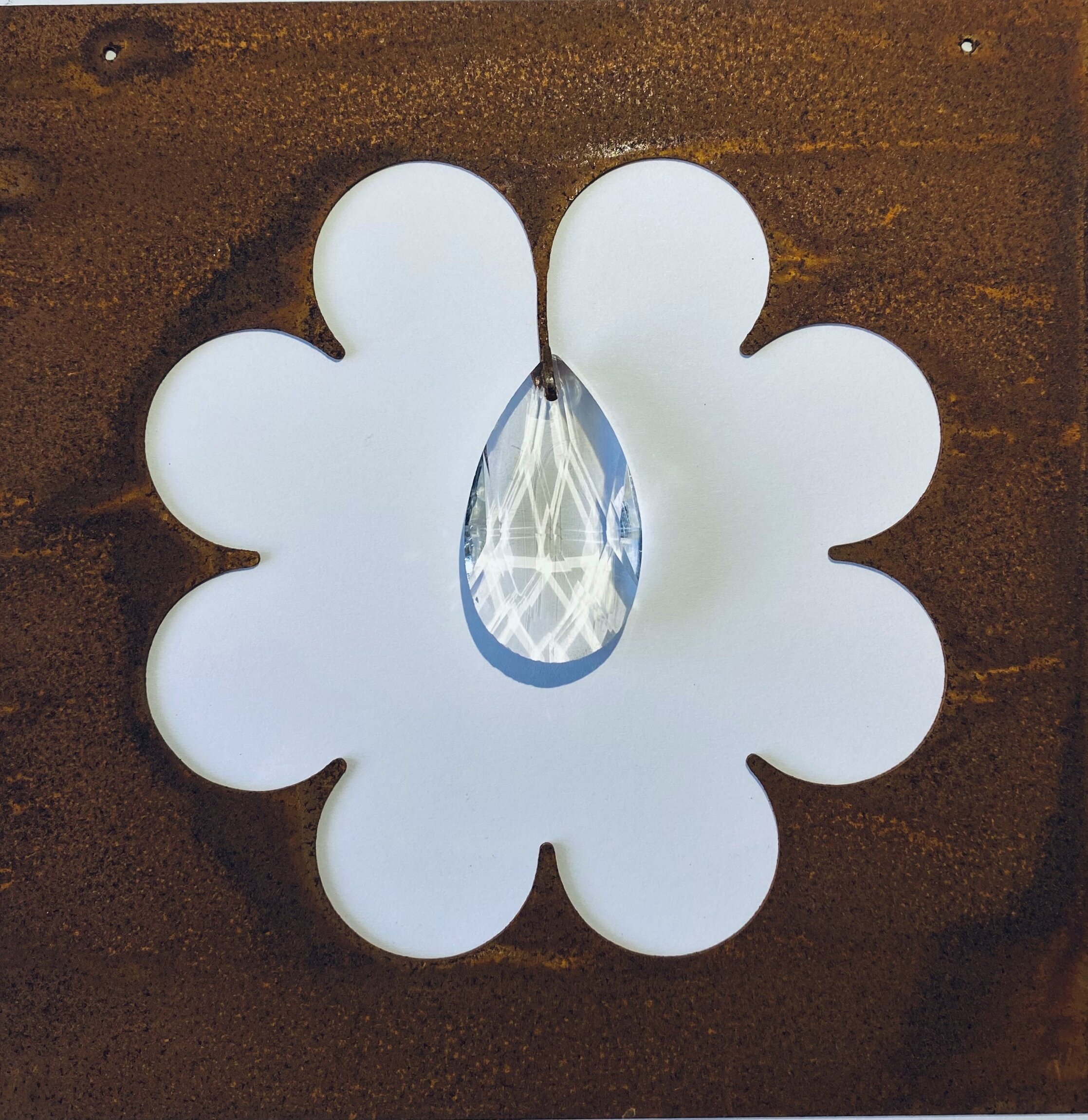 I mitten av blomman hänger en klar teardrop-formad prismasten. Denna prisma är elegant placerad så att den reflekterar och bryter ljuset på ett fascinerande sätt. Den fungerar inte bara som en dekorativ detalj utan lägger även till en dimension av ljusspel till designen, vilket kan skapa olika visuella effekter beroende på belysning och skugga.