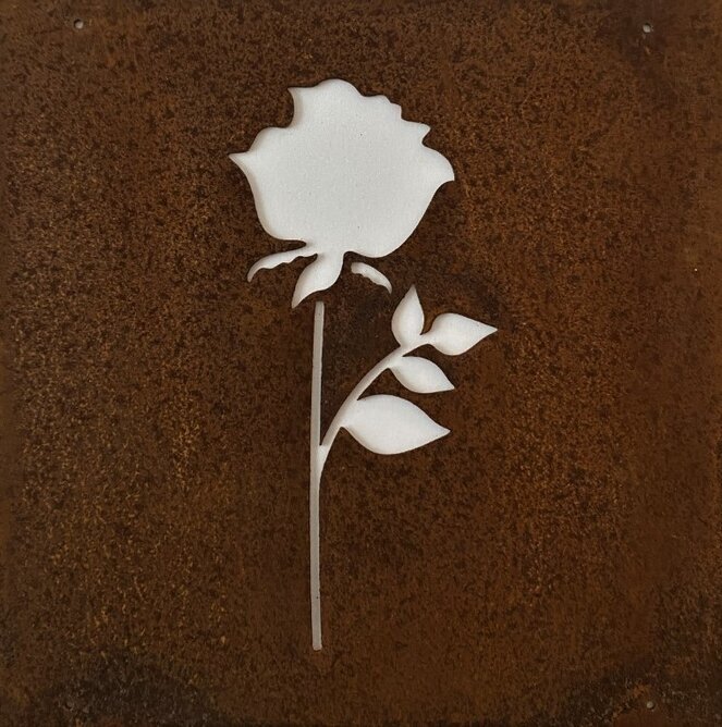 Skyltens stålstruktur har en karakteristisk rostig patina, vilket ger ytan en varm, jordnära ton. Patinan åstadkommer ett levande spel mellan ljus och skugga, där de mörkare partierna accentuerar de ljusa delarna av rosens form. Rosens silhuett är utskuren i en vitaktig färg, vilket skapar en tydlig kontrast mot den rostbruna bakgrunden. Detta gör att rosens former framhävs tydligt och ger en intressant visuell effekt.