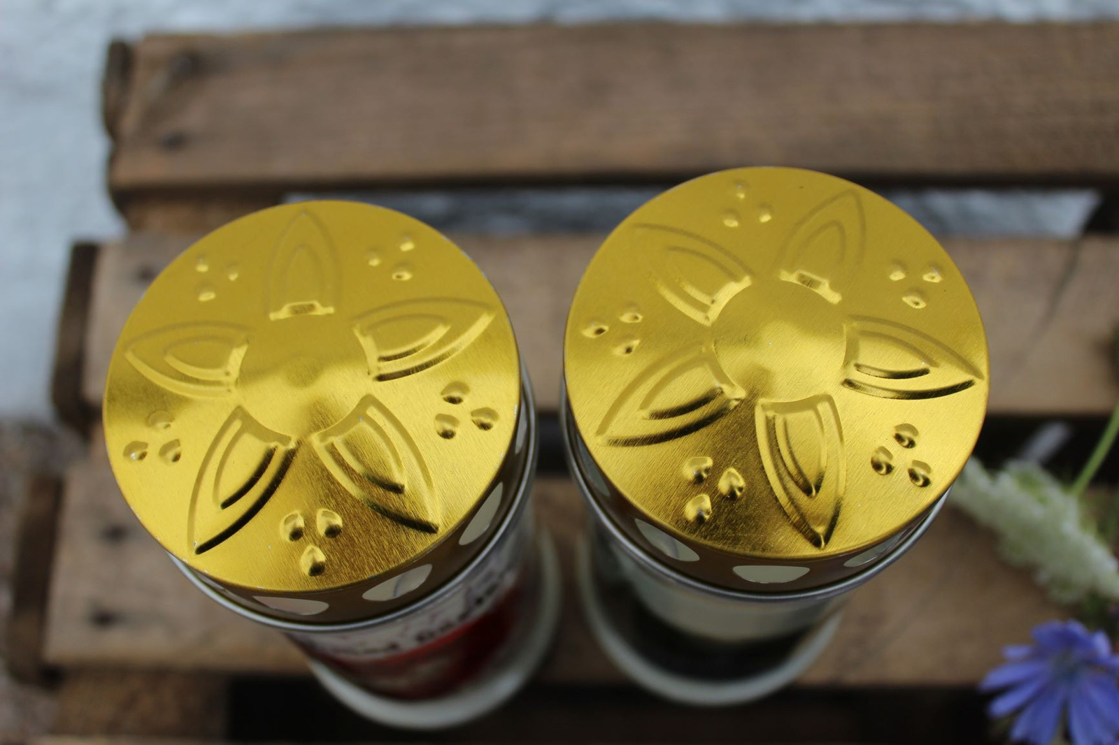 De guldfärgade locken fångar genast blicken med sina skarpa, reflekterande ytor. Varje lock är prytt med ett intrikat reliefmönster, bestående av stiliserade blommor och små prickar. Det utsökta mönstret ger en fin visuell balans och tillför en känsla av stil och detaljrikedom till produkten.