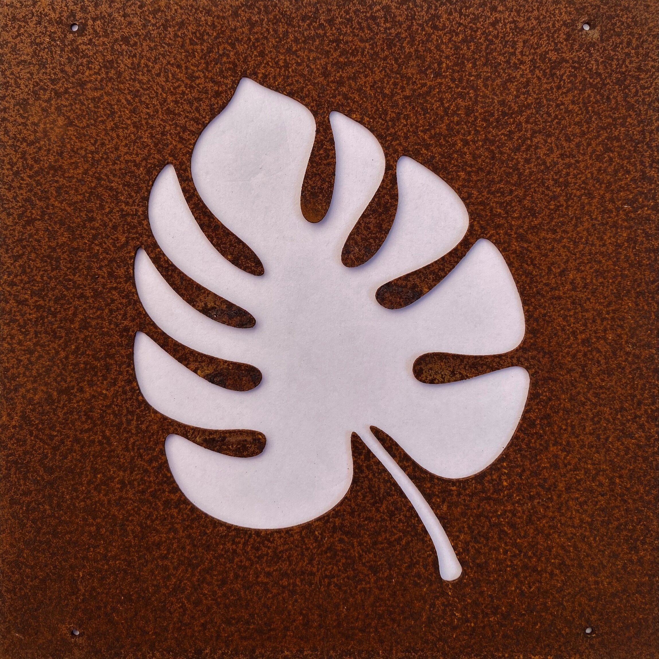 Bakgrunden präglas av ett rostigt metalliskt sken och ger en rustik patina som kontrasterar skarpt mot det rena, ljusa motivet av bladet. Denna rostiga yta skapar en taktil känsla och ett djup i bilden vilket ger hela verket en tredimensionell effekt. Avståndet mellan metallen och själva bladet skapar en känsla av skugga och höjdskillnad, vilket förstärker illusionen av ett levande blad mot en gammal, väderbiten yta.