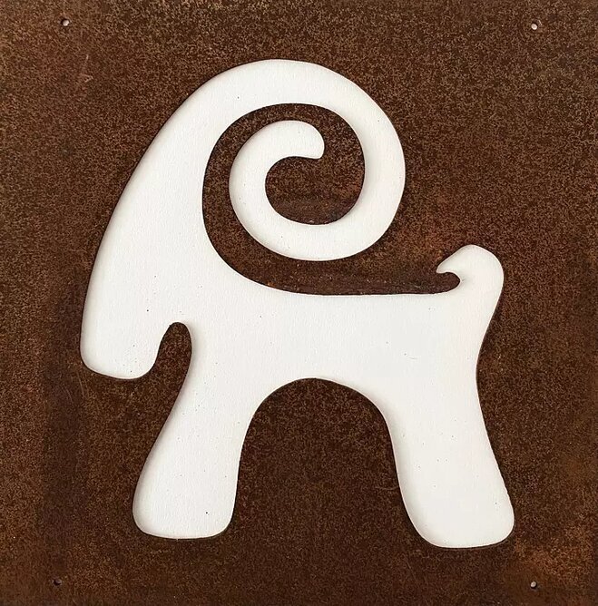 Dekorativ skylt i rostfinish som kan placeras med medföljande ståltråd på bl a armeringsnät. En fin detalj i trädgården. Passar till armeringsjärn storlek 15 x 15 cm.