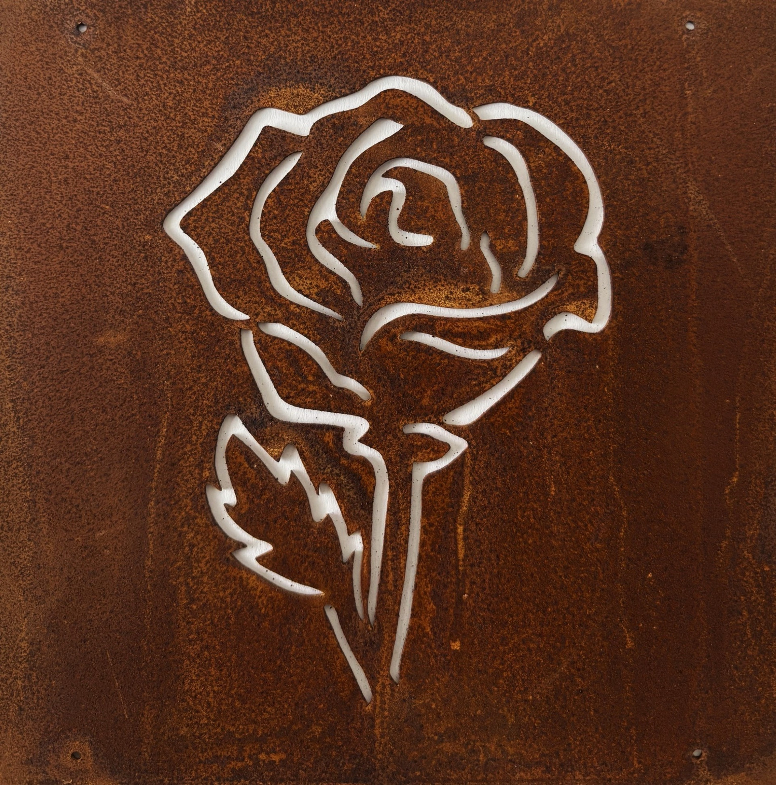Dekorativ skylt i rostfinish som kan placeras med medföljande ståltråd på bl a armeringsnät. En fin detalj i trädgården. Passar till armeringsjärn storlek 15 x 15 cm.