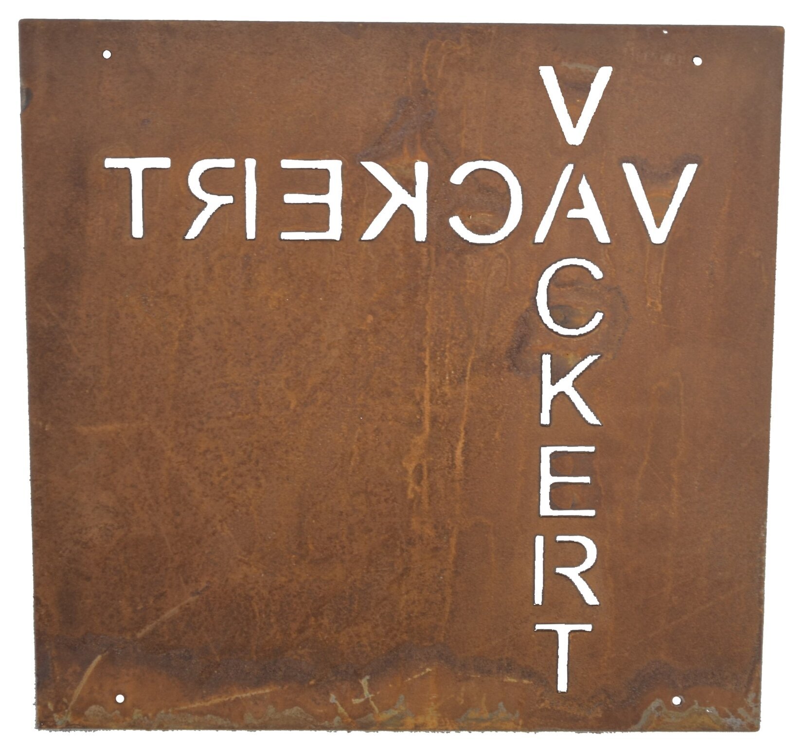 Det naturliga rostiga utseendet på metallen förstärker skyltens karaktär och antyder äkthet och varaktighet. De mörka och ljusa partierna i rostfärgen ger texturen ett djup och en variation, vilket ger ytan en visuellt tilltalande komplexitet. De fina detaljerna i roststrukturen ger en känsla av både råhet och autenticitet.