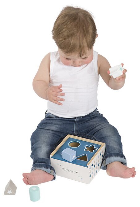 Färgerna på klossarna är milda och harmoniska, vilket är typiskt för Little Dutchs designestetik. På bilden syns tydligt hur barnet håller en av klossarna i handen och verkar koncentrerat försöka placera den i rätt form på lådan.