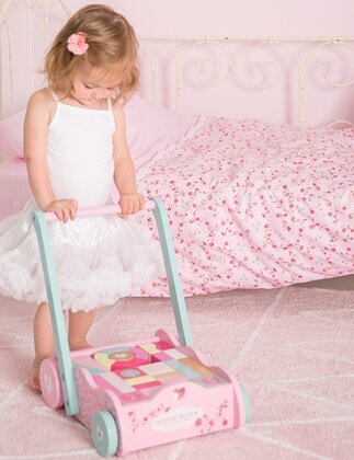 Bilden från Köpstaden.se visar ett inbjudande och färgglatt rum där barnets lekfullhet står i centrum. I förgrunden syns en liten flicka som håller i en Lära-Gå-Vagn från varumärket Little Dutch. Denna gåvagn är en central del av bilden och präglas av sina mjuka rosa nyanser med blommönster, vilket skapar en harmonisk och tilltalande visuell upplevelse.