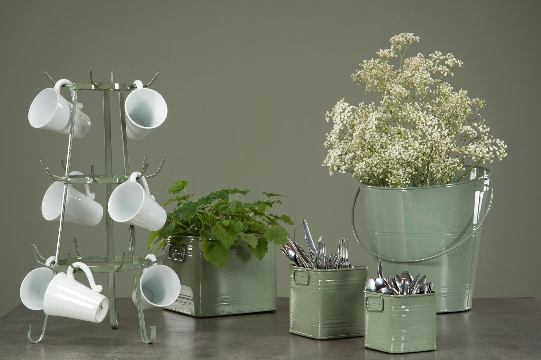 Bredvid hinken står två fyrkantiga behållare, även dessa i samma gröna emaljstil. Den större av dem innehåller en grön växt som sticker ut med sina friska blad, medan den mindre är fylld med bestick. Dessa behållare ger inte bara ordning och reda, utan för också in en känsla av natur och fräschhet till bilden.
