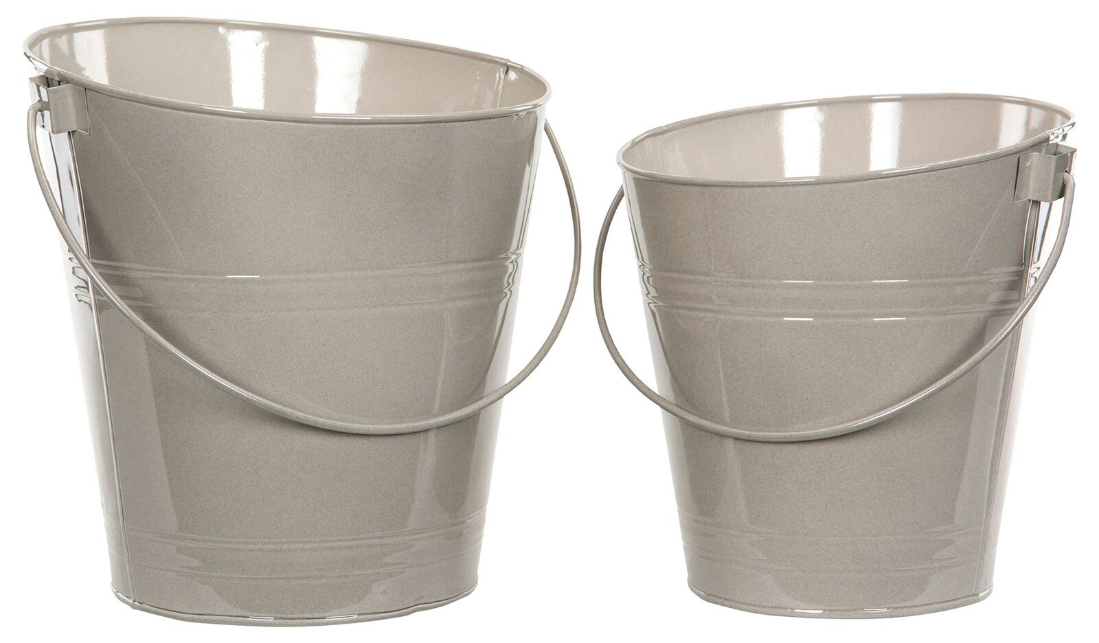 Handtagen, som är av samma färg som resten av hinkarna, är fästa på stabila metallöglor på sidan av varje hink. Detta ger ett praktiskt grepp och säkerställer att de är lätta att bära, vare sig de används inomhus för förvaring eller utomhus som trädgårdsredskap. Den ergonomiska designen av handtagen verkar genomtänkt för att vara både funktionell och stilren.