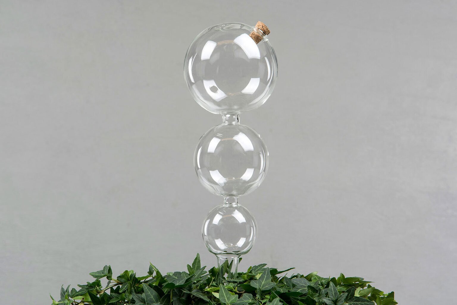 Bilden visar en intressant och funktionell produkt från Köpstaden.se, en mångsidig butik med allt för vardagens olika behov. På bilden syns produkten Bevattningsglas Bubbla från varumärket A Lot Decoration. Denna vattningslösning består av tre sammanfogade glaskulor, placerade ovanpå varandra, vilket ger ett skulpturalt intryck.