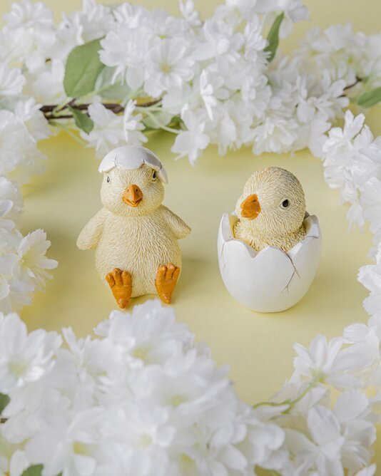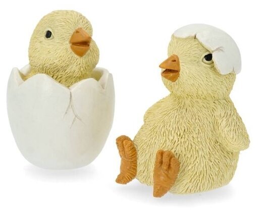 Ett sött litet dekorationsset med två kycklingar – en som tittar fram ur sitt ägg och en som sitter nykläckt med äggskal på huvudet.