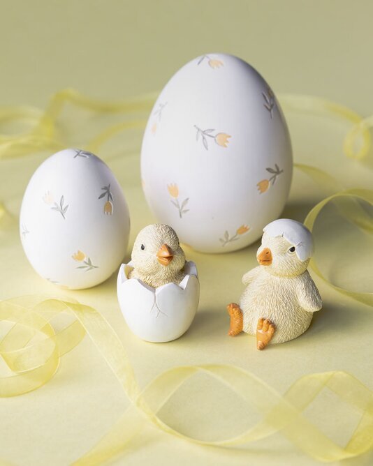 Ett sött litet dekorationsset med två kycklingar – en som tittar fram ur sitt ägg och en som sitter nykläckt med äggskal på huvudet. Läs mer