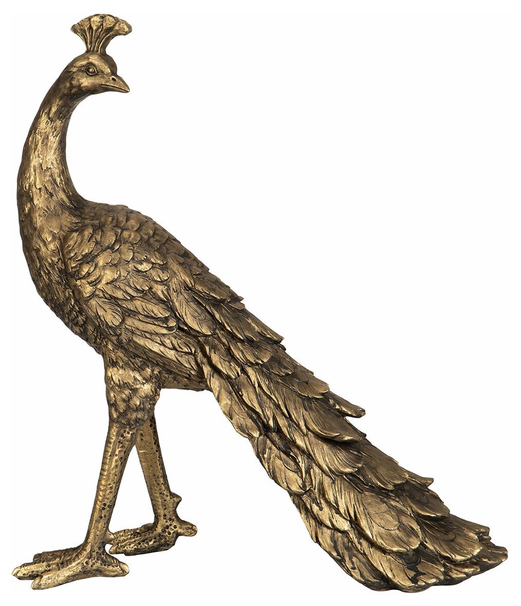 En stor och ståtlig påfågel i antik mässing som blir ett verkligt blickfång i hemmet. Med sina vackert skulpterade fjädrar och eleganta hållning sprider den en känsla av lyx och tidlös elegans.