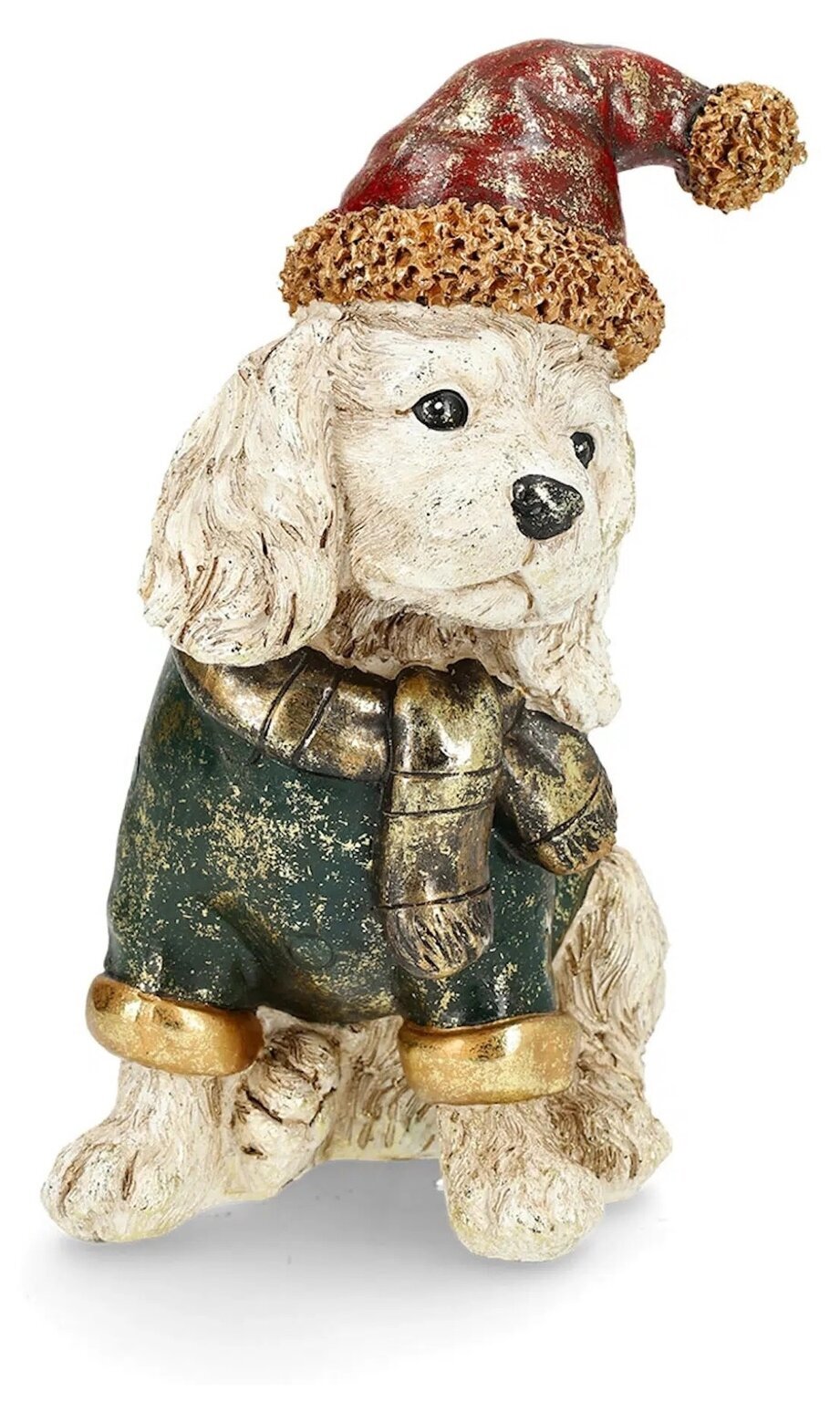 En charmig liten julhund som sprider värme och glädje, med sin röda tomteluva, gröna dräkt och gulddetaljer är den här figuren en perfekt detalj för att skapa en mysig och lekfull julstämning i hemmet.