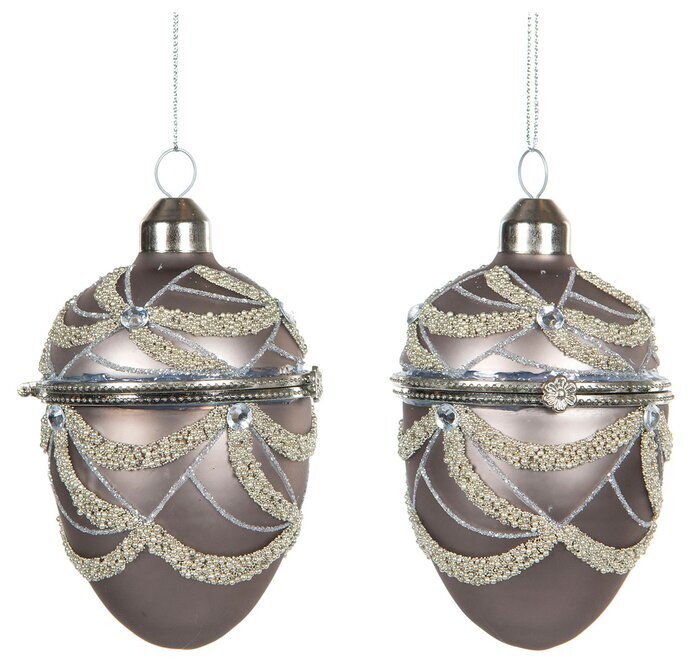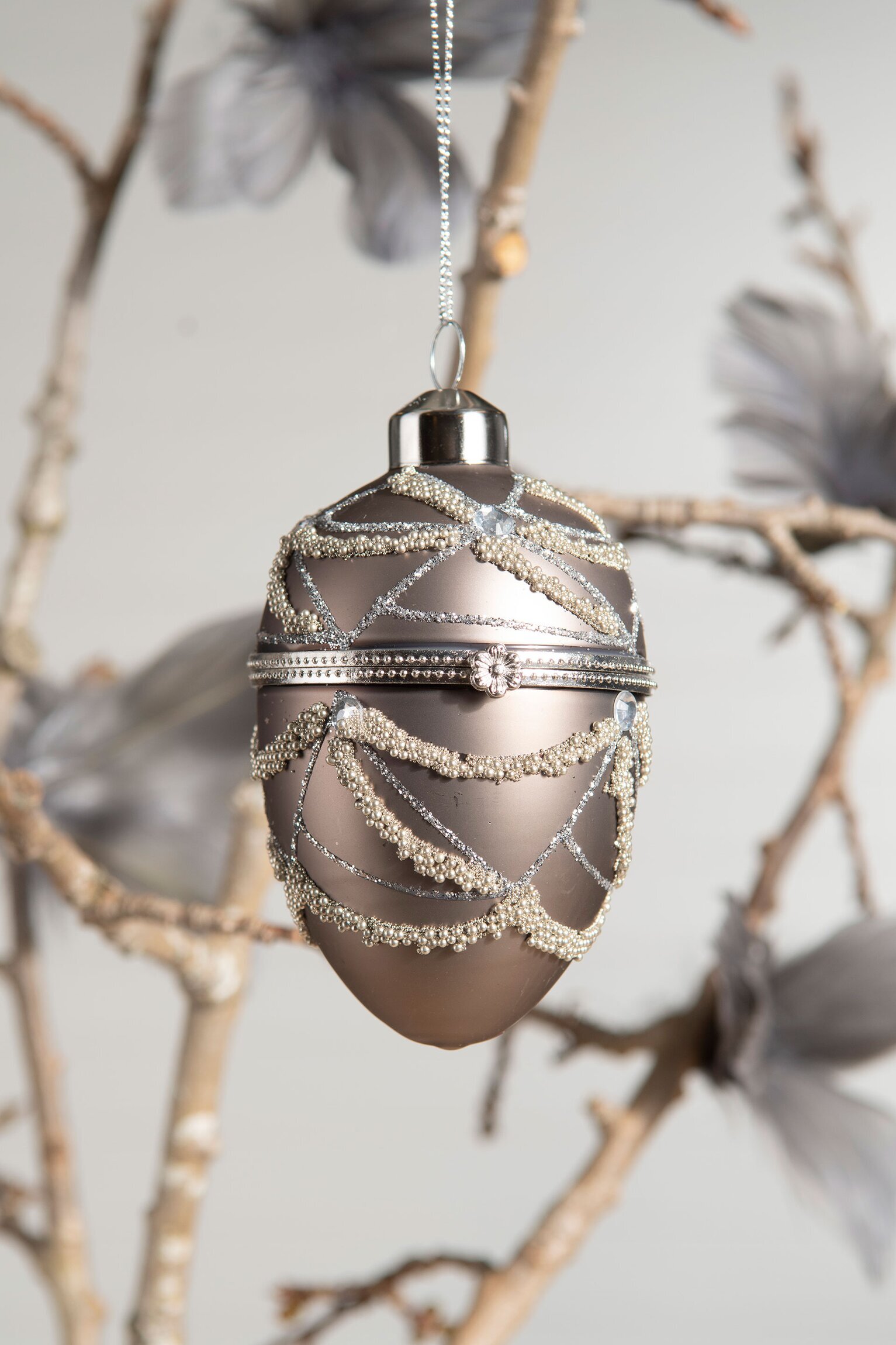 Vackra påskdekorationer i form av 4 stycken öppningsbara ägg i en fin mullvadsfärgad nyans. Äggen är dekorerade med små pärlor & glitter samt medföljande snöre.